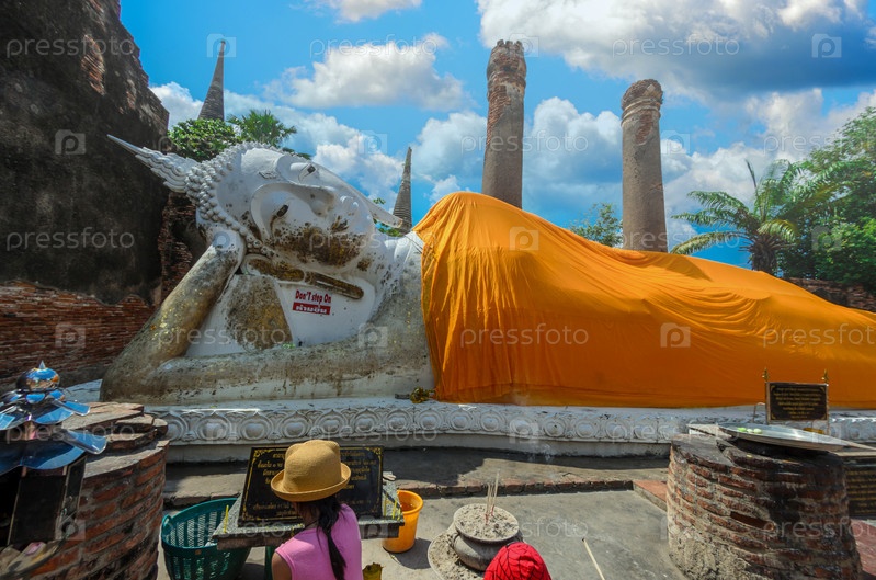 Аюттхая Ват Яй Чаймонгкол, Таиланд - 29 октября 2015 г.: Большая белая достопримечательность позы сна Будды в храме Ват Яй Чаймонгкол, Аюттхая, Таиланд
