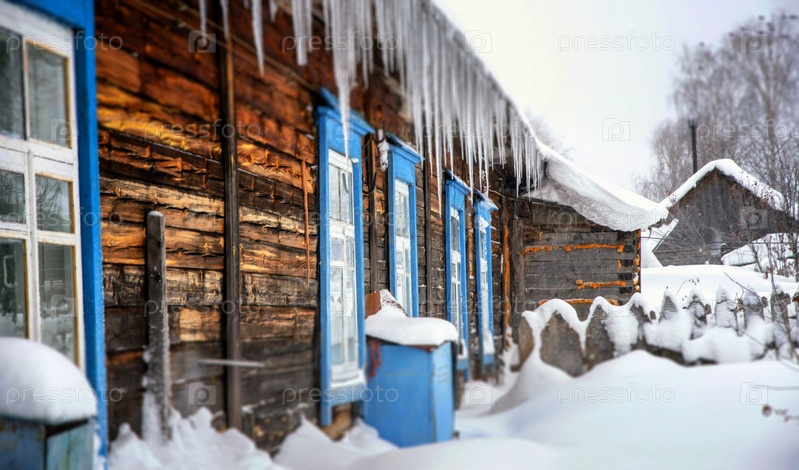 Заснеженный деревенский дом в сельской местности Пермского края в России. Деревня Рябинино в зимнее время
