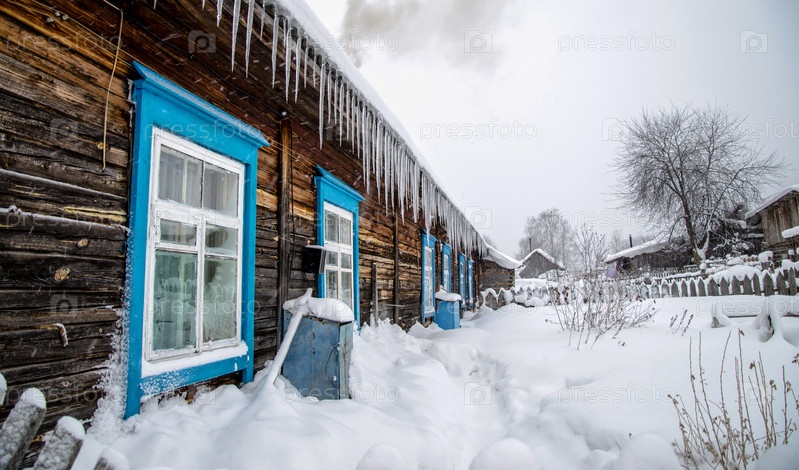 Заснеженный деревенский дом в сельской местности Пермского края в России. Деревня Рябинино в зимнее время