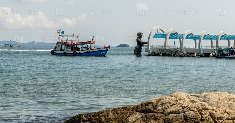 Районг, Таиланд - 21 октября 2015 г.: Пирс Ко Самет и статуя бога Ко Самет - известное туристическое направление Районга, Таиланд