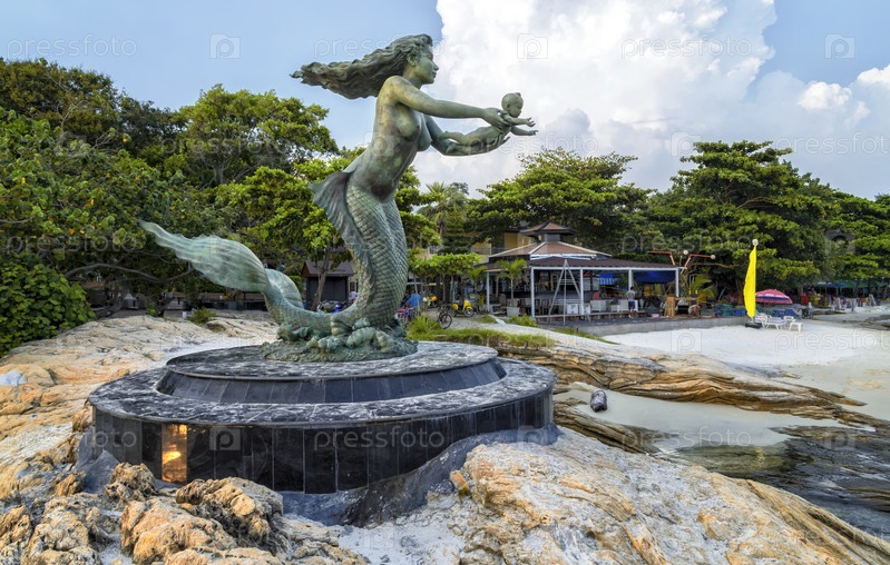Статуя русалки и дети на пляже Сай Кео на острове Самед, провинция Районг, Таиланд, 18 октября 2015 года