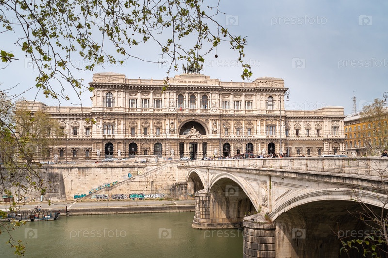 Рим, Италия - 04.02.2019: Римский дворец правосудия, резиденция Верховного кассационного суда, на берегу реки Тибр, на закате, с ветвями деревьев и движением по мосту