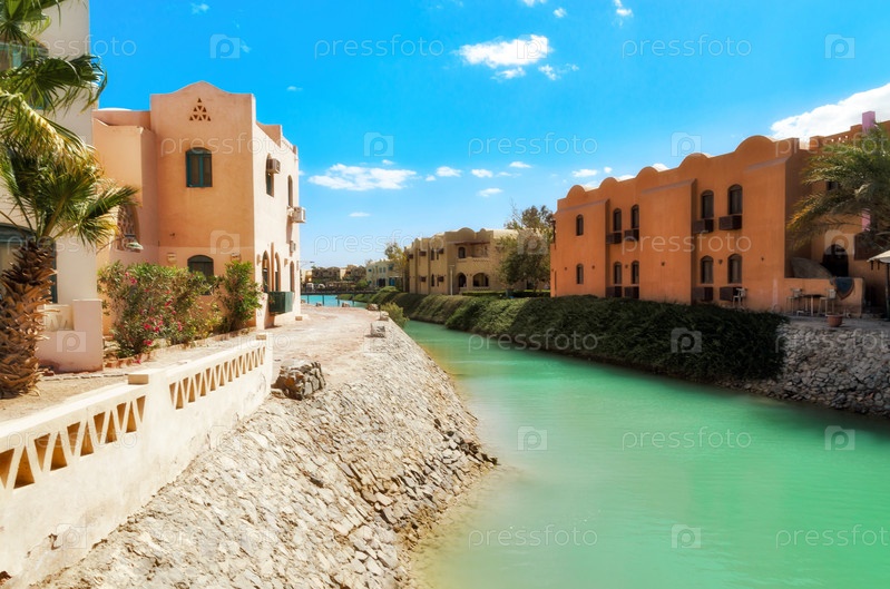 Каналы, здания и курортное оборудование на курорте Эль-Гуна. Египет, Северная Африка