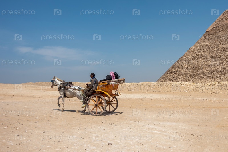 Гиза, Каир, Египет - 13 апреля 2021 года. Конная повозка с людьми возле египетских пирамид на плато Гиза недалеко от Каира в Египте