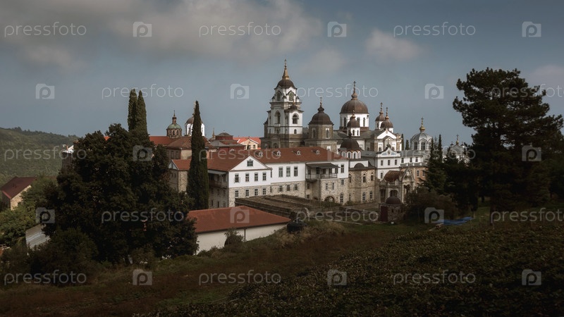 Живописный пейзаж скита Святого Андрея, православная церковь на горе Афон, Македония, Греция