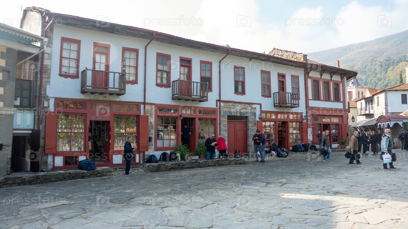 Гора Афон, Кариес, Греция - 21 октября 2019 г.: Монахи и верующие в Кариесе на горе Афон, Греция. Кариес – столица афонской монашеской общины