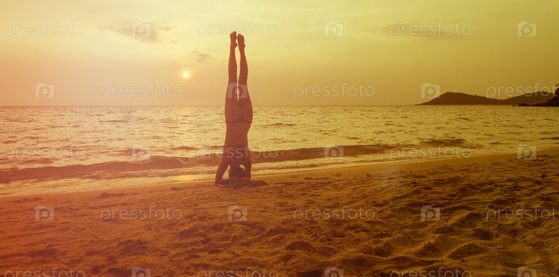 Молодая женщина занимается йогой на морском пляже в азии во время красивого заката