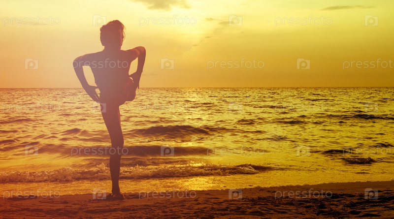 Молодая женщина занимается йогой на морском пляже в азии во время красивого заката