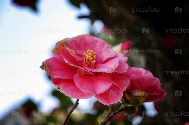 Цветы красной камелии цветут в монастырском саду весенним днем (Афон, Греция)
