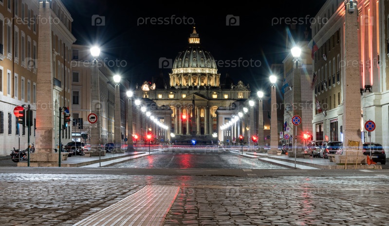 Собор Святого Петра в Риме вечером. Ночная съемка