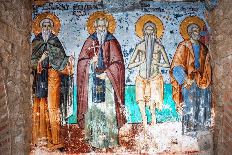 Гора Афон, Греция - 21 октября 2019 г.: Ветхие фрески святых на внешней стороне церкви Протатона в кариесе, гора Афон