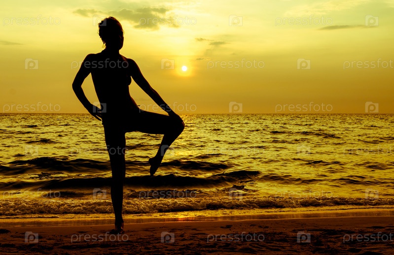 Молодая женщина занимается йогой на морском пляже в азии во время красивого заката