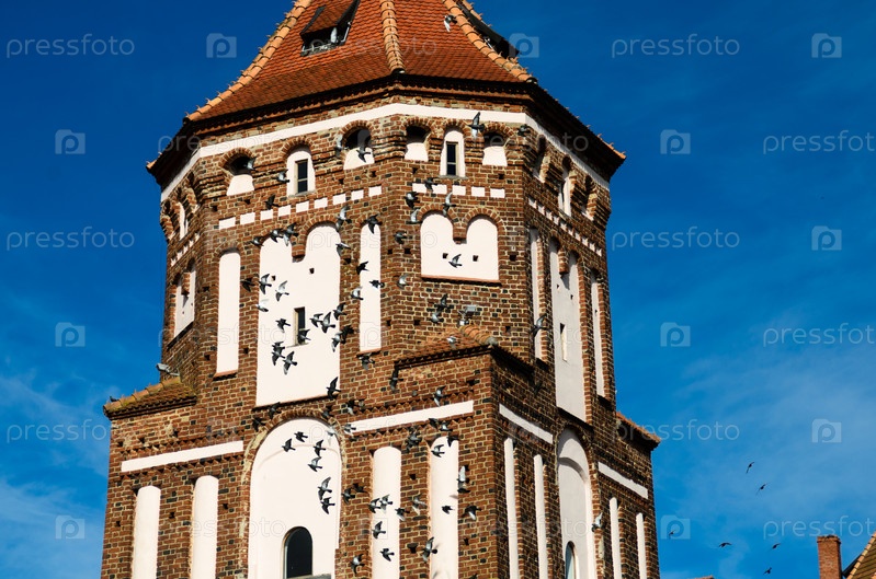 Мир, Беларусь. Живописный вид на комплекс Мирского замка. Архитектурный ансамбль феодализма, памятник древней культуры, наследие ЮНЕСКО. Знаменитая достопримечательность в летний солнечный день под голубым небом с облаками