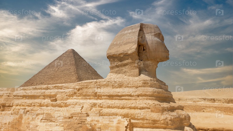Большой сфинкс и пирамиды, известное чудо света, Гиза, Египет
