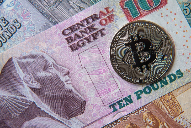 Банкноты египетских фунтов и монеты криптовалюты. Концепция инвестиций в криптовалюту. Майнинг или торговля криптовалютой