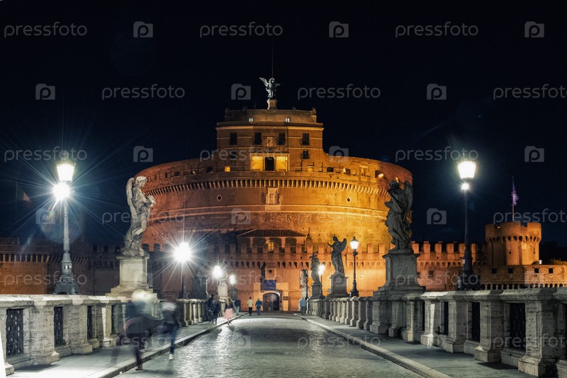 Мавзолей Адриана, обычно известный как Замок Сант-Анджело, и мост Сант-Анджело, освещенный ночью. Фото Рим, Италия