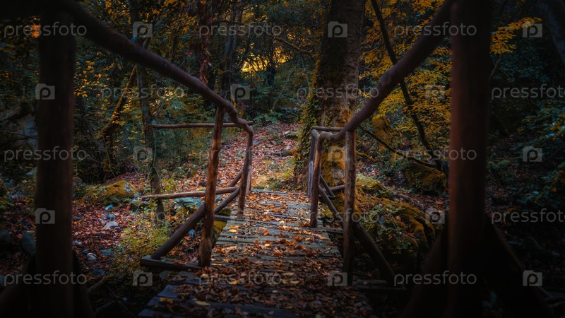 Старый деревянный мост через ручей в осеннем европейском лесу. Греция, Афон