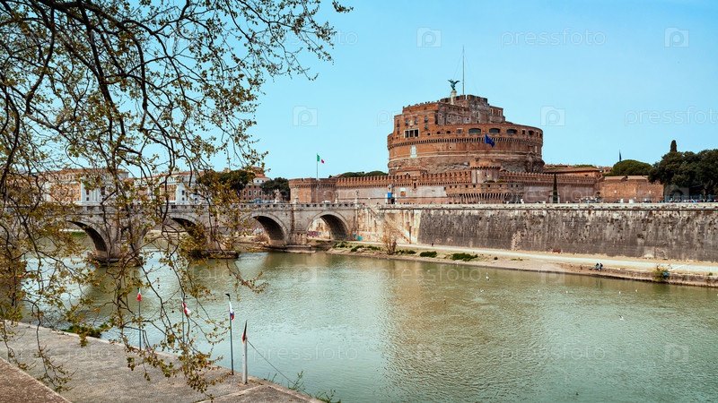 Рим, Италия, 02 апреля 2019 г.: Вид на знаменитый замок Святого Ангела и мост через реку Тибр в Риме, Италия