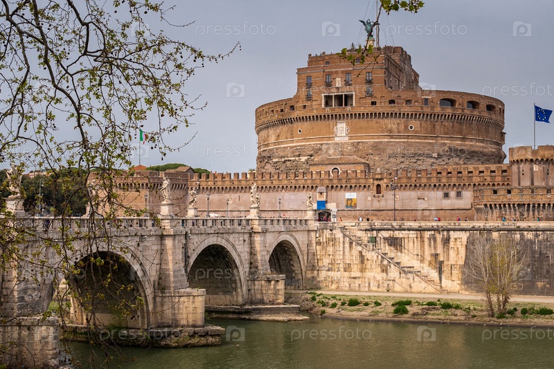 Рим, Италия, 02 апреля 2019 г.: Вид на знаменитый замок Святого Ангела и мост через реку Тибр в Риме, Италия