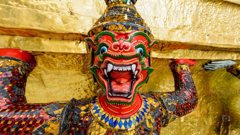 Гигантские статуи под золотой пагодой в храме Ват Пхра Кео, Бангкок, Таиланд