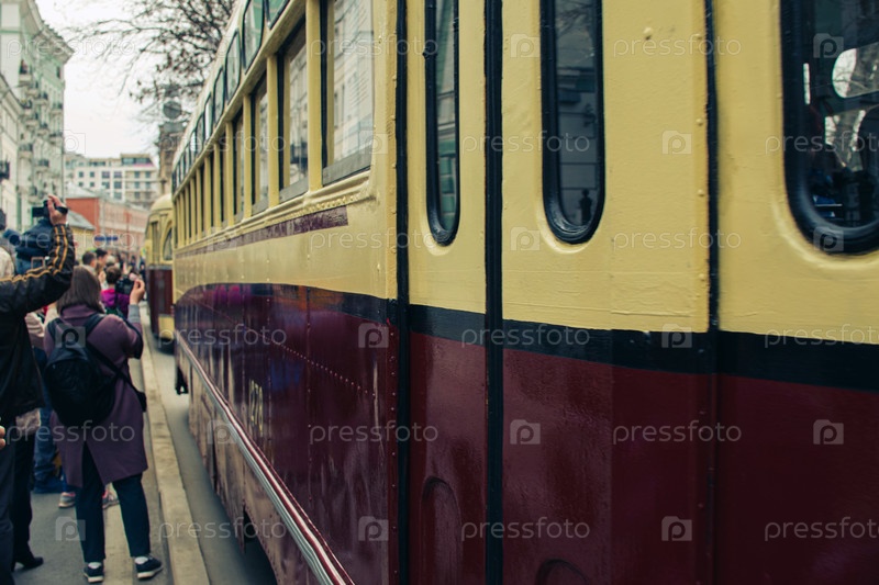 Ежегодный парад трамваев в Москве, Россия. Ретро, классические и современные трамваи движутся по маршруту центра Москвы. Вид сбоку на трамвай