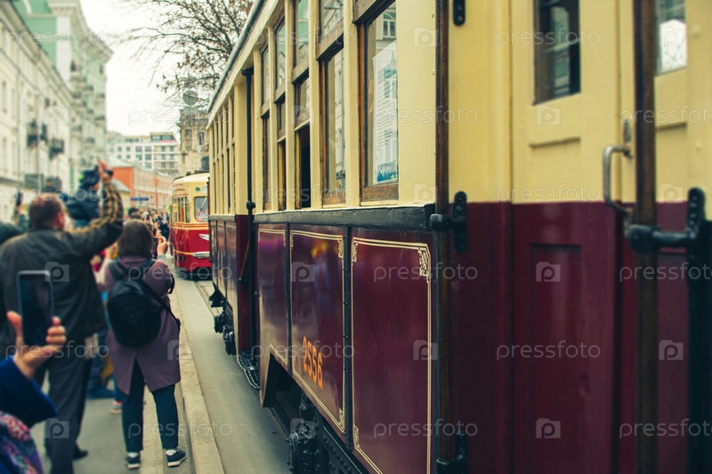 Ежегодный парад трамваев в Москве, Россия. Ретро, классические и современные трамваи движутся по маршруту центра Москвы. Вид сбоку на трамвай