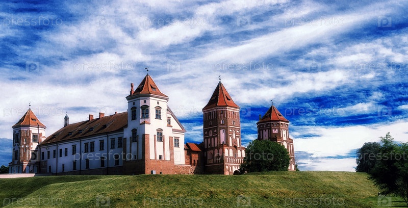Мир, Беларусь. Живописный вид на комплекс Мирского замка. Архитектурный ансамбль феодализма, памятник древней культуры, наследие ЮНЕСКО. Знаменитая достопримечательность в летний солнечный день под голубым небом с облаками