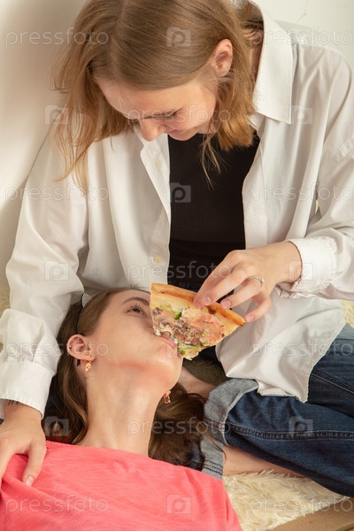 Девочки едят пиццу
