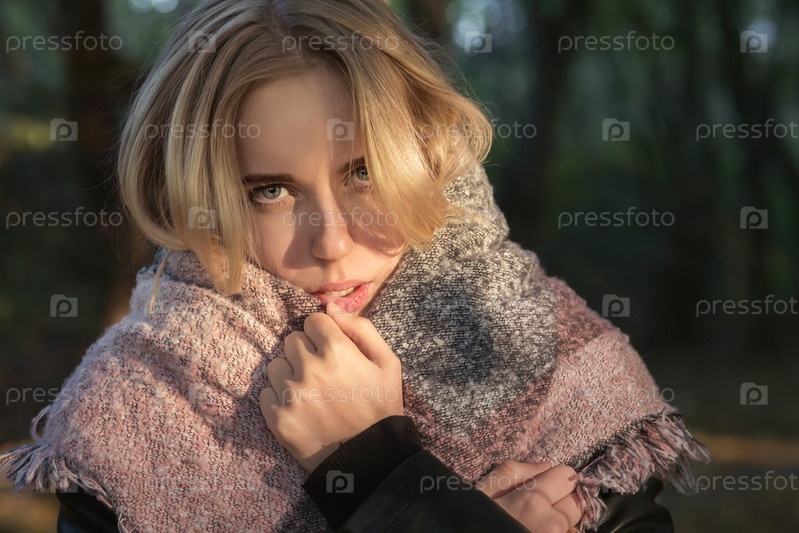 Грустная девушка в шарфе смотрит в камеру на открытом воздухе