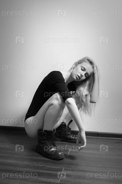 Грустная блондинка в черных мужских сапогах сидит на корточках на полу, монохромный