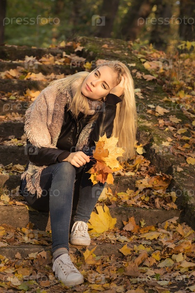 Грустная девушка в осеннем парке сидит, тонированное изображение