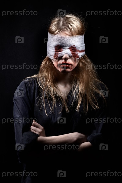 Серьезная слепая испуганная женщина на черном фоне