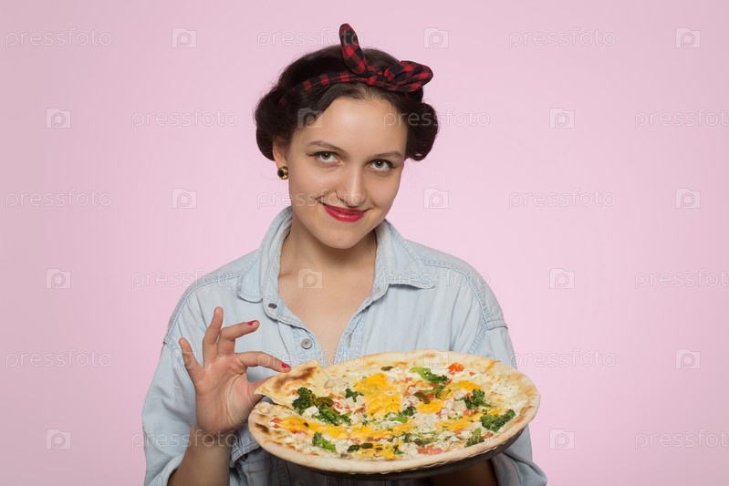 Женщина представляет пиццу