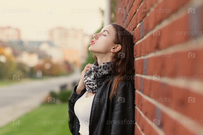 Чувственно возбужденная молодая женщина в кожаном пальто, стоящая возле кирпичной стены