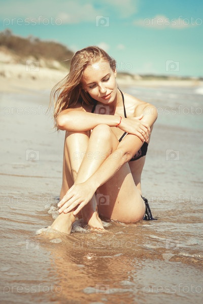 Блондинка в купальнике сидит на морском пляже и загорает