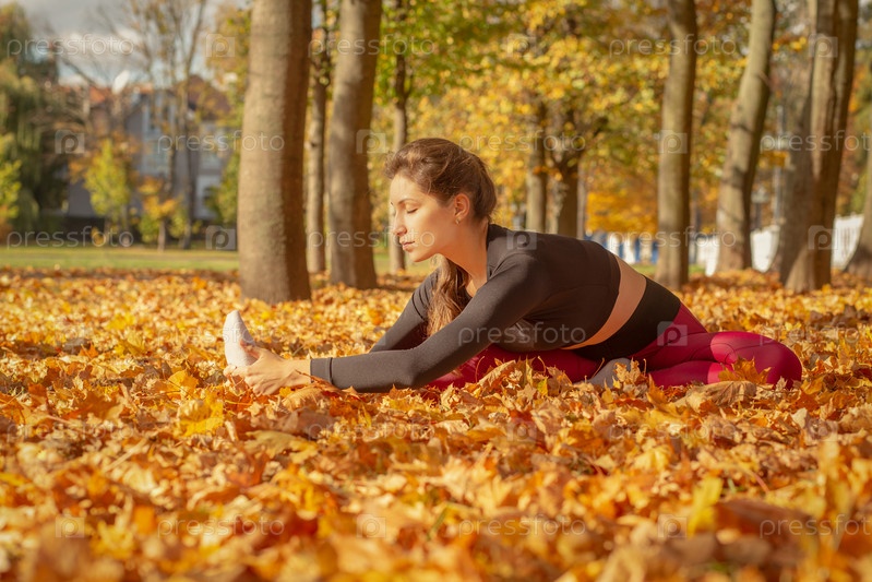 Стройная спортивная женщина растягивается в осеннем городском парке