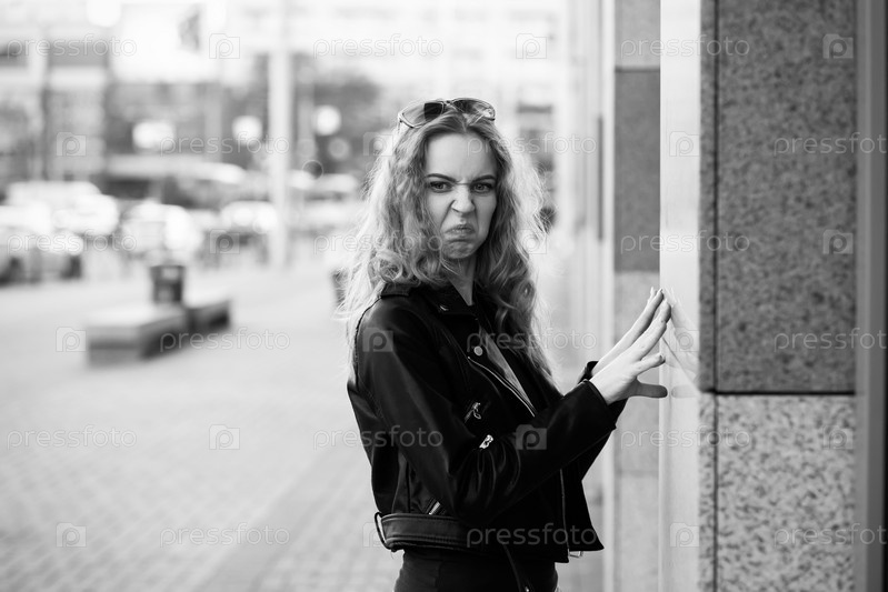 Веселая грустная серьезная блондинка в кожаном пальто стоит на улице, морщась и глядя в камеру
