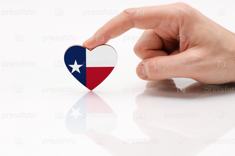 Флаг штата Техас. Любите и уважайте Техас. Мужская рука держит сердце в форме флага Техаса на поверхности белого стекла. Понятие патриотизма и гордости