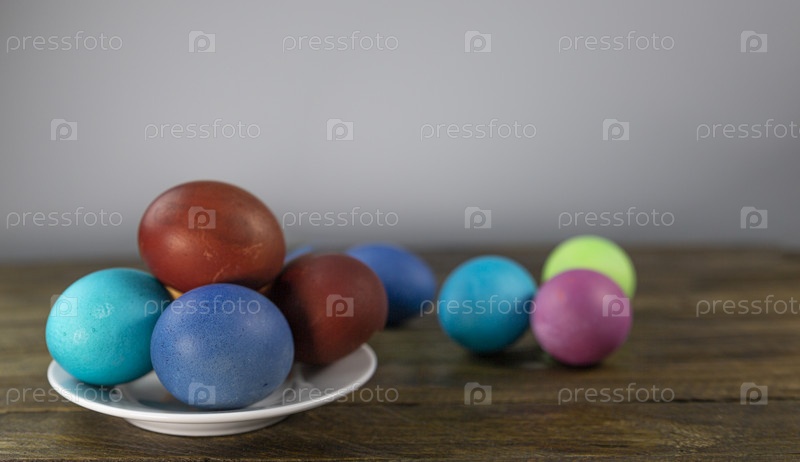 Пасхальная открытка. Разноцветные яйца в блюдце