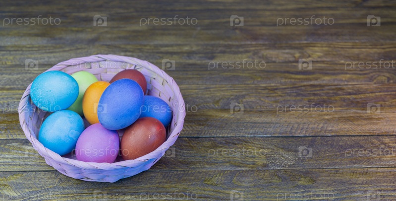 Пасхальная открытка. Разноцветные яйца в блюдце