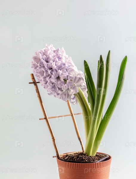 Красивый цветущий гиацинт в цветочном горшке. Вертикальная обрезка. Крупный план