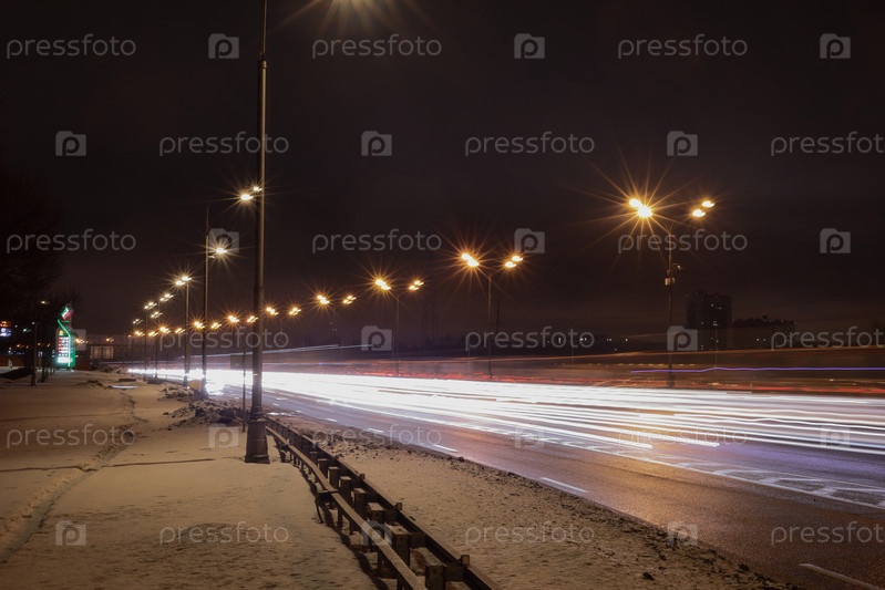 Ночной трафик на дороге зимой. Огни машин на дороге
