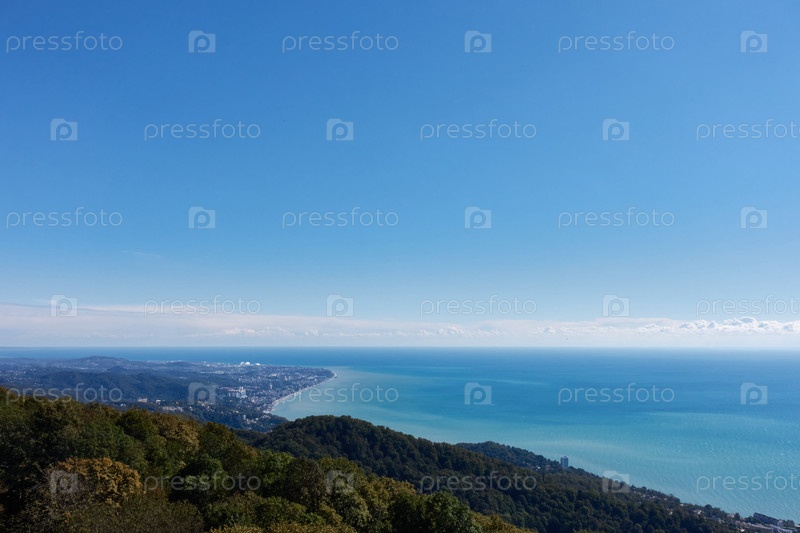 На берегу моря стоит город, за которым горы, поросшие лесом. На горизонте белые облака