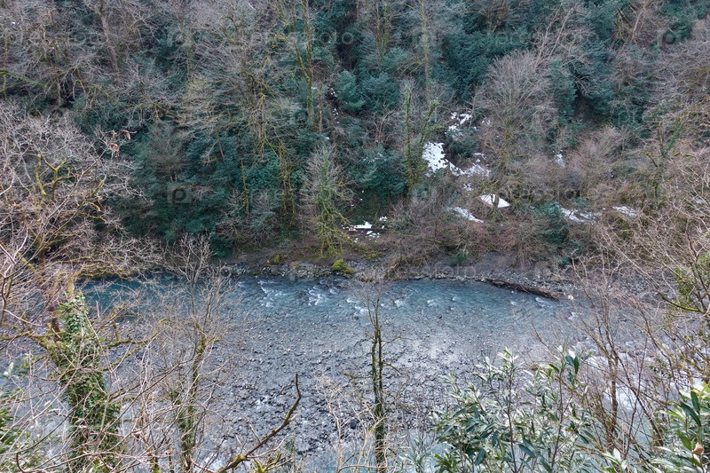 Вид на горную реку с дрона. Зимний лес, местами снег лежит на земле. По ущелью протекает бурная горная река с порогами