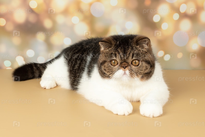 На красочном праздничном фоне студии играет красивая экзотическая короткошерстная кошка