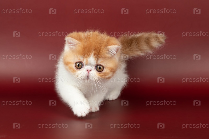 Маленький красивый рыжий котенок экзотический на бордовом фоне в студии. Окрас персидского котенка рыжий с белым
