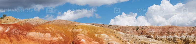 Красочные холмы в Республике Алтай под названием Марс 1. Фон окружающей среды, панорамный вид. Естественная цветная текстура марсианского ландшафта из песчаника в горах Алтая