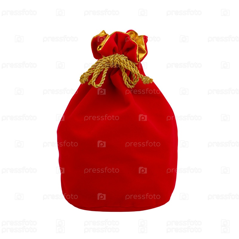 Красный подарочный бархатный мешочек, перевязанный золотой веревкой, изолированный на белом фоне, крупный план