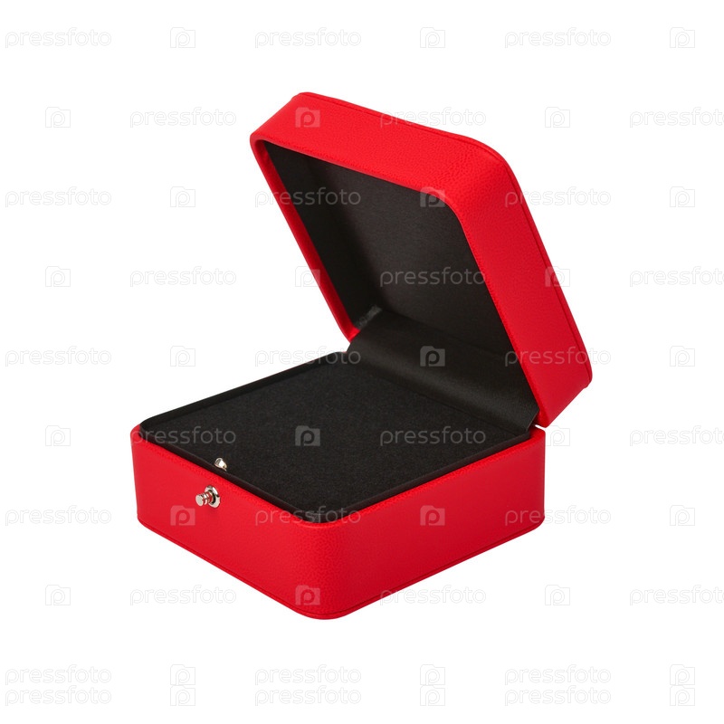 Вид сбоку на открытую красную подарочную коробку с черным бархатом внутри, изолированную на белом фоне, малую глубину резкости