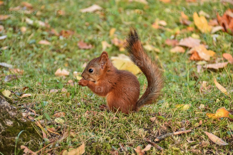 Белка крупным планом, у белки есть орех, чтобы расколоть в парке
